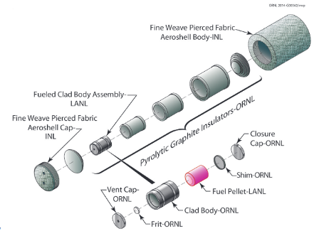 A: They are similar, but as the RTU does not need the thermocouple assembly or wiring, they are also different. The outermost aeroshell is made from extremely tough material called fine-weave pierced fabric, plus a graphite-based insulator to protect the fuel in a RHU from potential physical impacts, fires, and atmospheric reentry conditions. The fuel is encapsulated in a high-strength, platinum-rhodium metal shell (or “clad”) that further protects and helps contain the fuel during a potential accident (Figure 2).