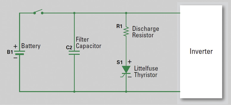Filter capacitors across the battery will charge up to the battery pack voltage. An accident and the disconnection of charged capacitors from the main battery can still cause high voltages in the system. So designers should provide a means of discharging these capacitors. The discharge-switch circuit must handle high load currents and an occasional overload. The discharging function must stay operational over a wide range of environmental conditions during the vehicle’s life. Also, the discharge function should activate via a simple trigger control signal.