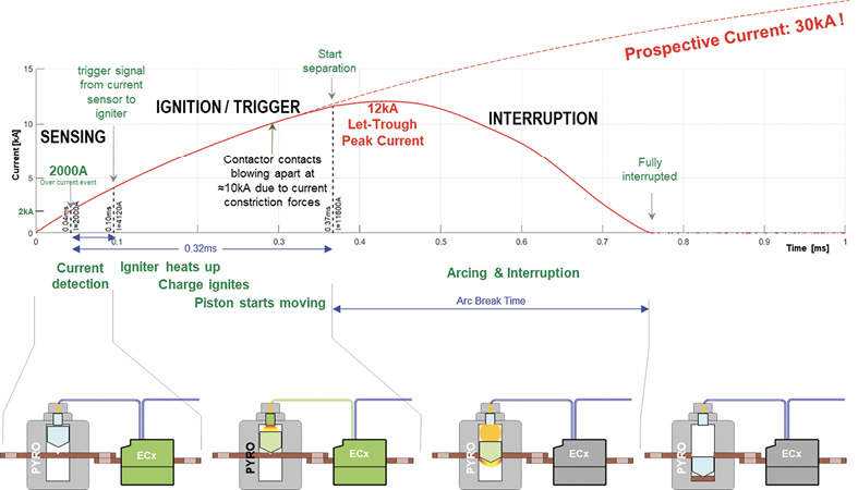 Such scenarios show why it is necessary to disconnect the battery from load circuits when there is a catastrophic failure. Anticipating such conditions, designers should ensure high-power circuits have incorporated fast overload protection. The battery can deliver, almost instantaneously, potentially up to 30 kA during a short-circuit failure. High-voltage fuses have current interrupt ratings below 30 kA and an opening time of up to 50 msec. Consequently, they can’t open fast enough to prevent the massive current rise and protect against potentially irreparable damage. The battery distribution unit needs a better solution, which is a pyro switch.