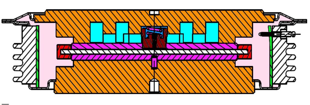 In addition to optimal device design, packaging is a key to achieving the levels of performance expected from a BT (Figure 3). Maintaining package integrity during high-energy discharges requires the inclusion of extra space inside the cathode pole element. That space provides an expansion volume that decreases internal gas pressure in the device and improves heat dissipation from the plasma during a fault event. In the figure below, the expansion volume (bluish green) is shown in the package’s lid (upper orange area). In addition, the ceramic package walls are lined with a silicone rubber strip (green) to help prevent the wall from cracking in the presence of excessive plasma that the expansion volume space cannot absorb. Finally, a labyrinth seal between the ceramic wall and the lid provides additional protection to the cathode sealing flange.