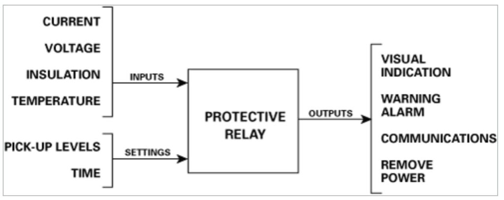 A protection relay is a smart device that receives inputs like current, voltage, resistance, temperature, or even light, compares them to set points, and provides outputs such as visual feedback in the form of indicator lights and/or an alphanumeric display, communications, control warnings, alarms, and turning the power off and on. They are used for motor protection and ground fault protection in industrial settings. A regulating relay is a special class of protection relay that activates when an operating parameter deviates from preset limits.