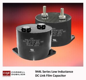To support the needs of high-frequency switching inverters and converters, Cornell Dubilier Electronics, Inc. has announced its 944L Series of low inductance, high current DC link film capacitors. Applications in green energy inverter systems and Level 3 EV chargers are placing greater demands on power conversion circuits that deliver more power with a smaller footprint. The 944L Series was designed with these applications in mind.