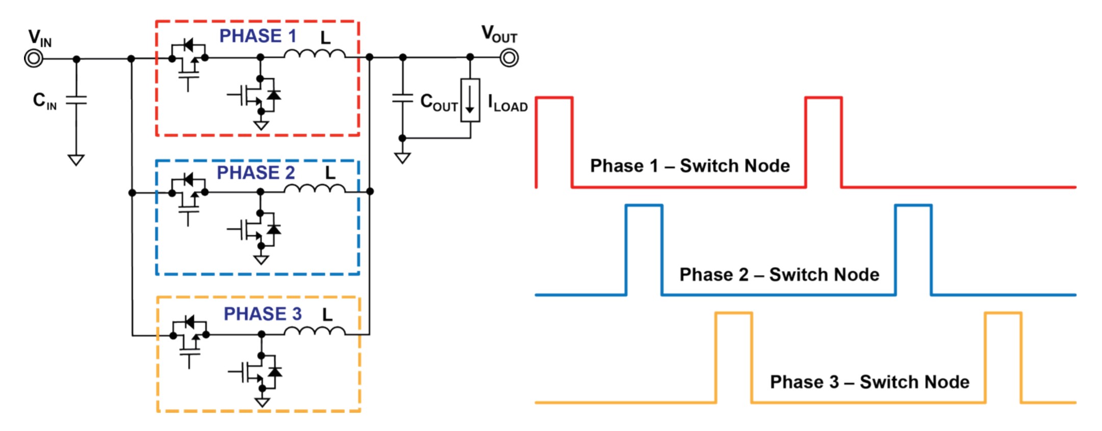 A multiphase PoL consists of a series of paralleled buck power stages (phases), each with its own inductor and power MOSFETs, driven by a single controller. The phases generally share input and output capacitors. The phases are interleaved, which means that they are switched at intervals equal to 360° / n throughout the switching period, where n is the total number of phases. Multiphase PoLs can have from 2 to 12 or more phases. The higher the needed load current, the more phases that are used. In addition, interleaving more phases effectively increases the operating frequency of the regulator.