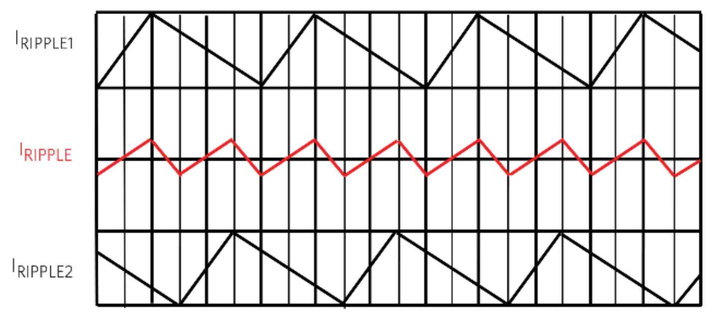 As illustrated below, even with just two phases, there is significant ripple current cancellation in the output filter and a reduced ripple voltage across the output capacitors compared with a single-phase solution.