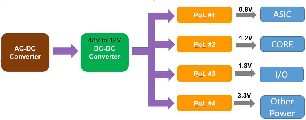 Point-of-load converters (PoLs) are used in distributed power architectures (DPAs) to step down a relatively high power distribution bus voltage to the lower voltages needed by system components such as microprocessors, ASICs, and other digital ICs. DPAs are used in systems of all sizes to improve power distribution efficiency. Larger systems tend to use higher distribution voltages. In small portable systems, 5Vdc or 12Vdc are common, 48Vdc is often seen in data centers, and in larger installations such as large data centers or telecommunications central offices, 380Vdc is used. In the case of distribution voltages of 48V and above, the distribution voltage is stepped down to an intermediate voltage to power the PoLs, creating a two-stage power conversion chain.