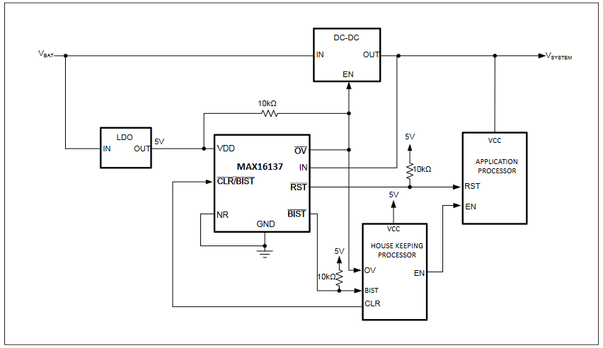 That’s just one role of the MAX16137. In addition, its Built-In-Self-Test (BIST) diagnostic capability monitors the health of the internal reset circuit during power-up. If that built-in self-test fails, the MAX16137 pulls its BIST output low to alert the associated processor.