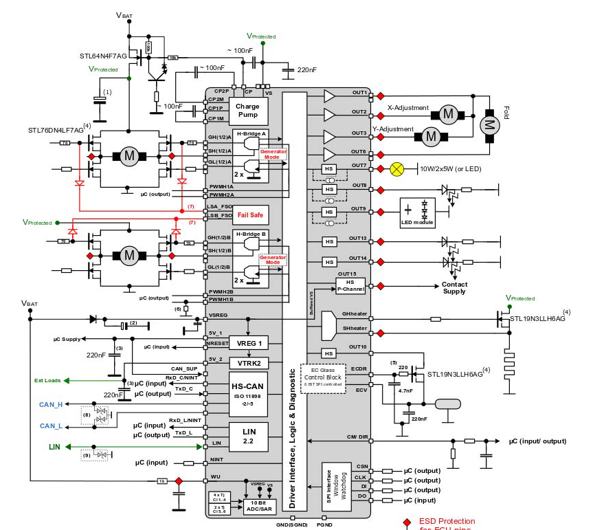 The L99DZ200G incorporates two configurable half-bridges (7.5 A), two other half-bridges (0.5 A), a gate driver for an external MOSFET to control mirror heating, a control block, and a high-side driver for electro-chromic mirror dimming, and five LED high-side drivers (Figure 2).
