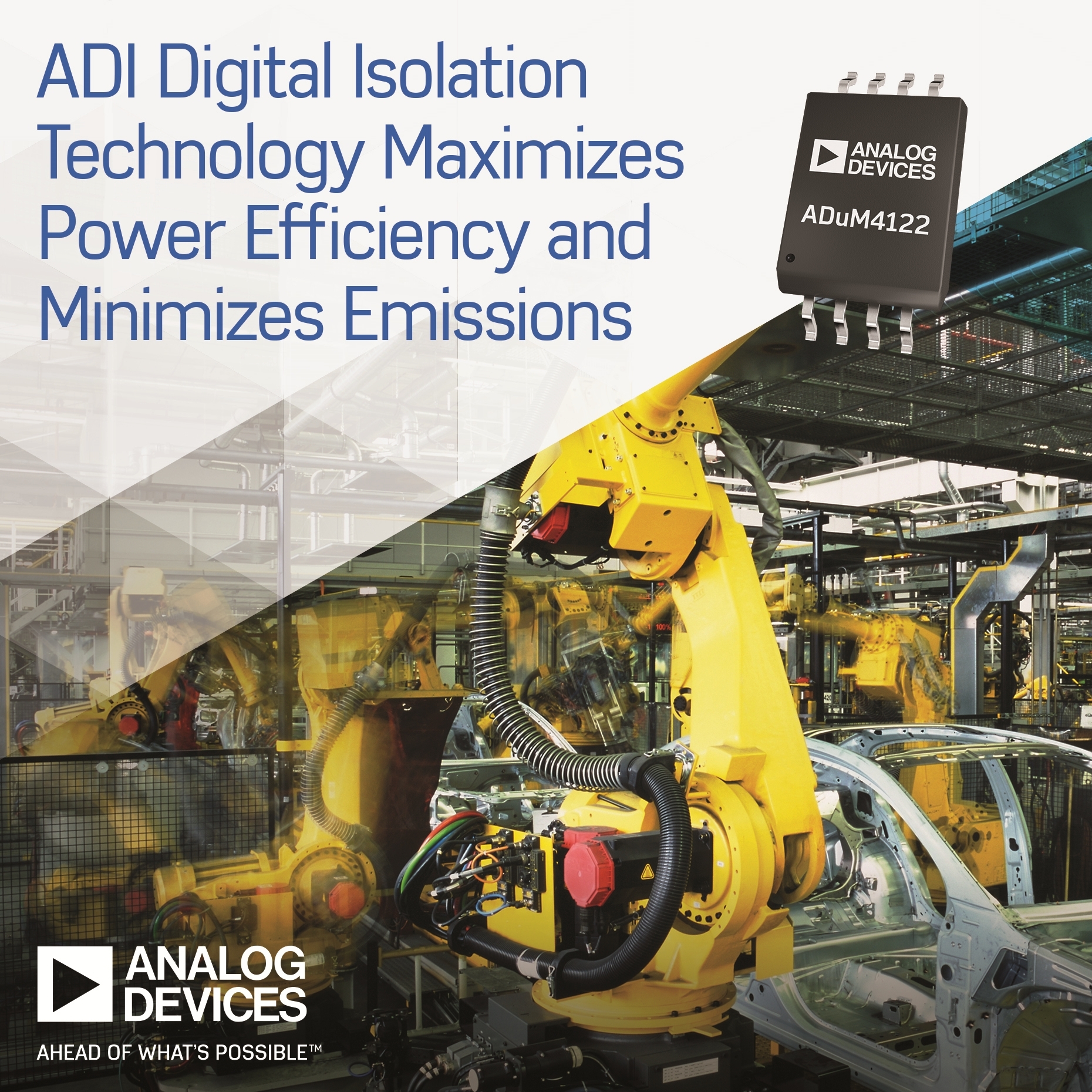 The ADuM4122 further improves system capabilities with high common-mode transient immunity and low propagation delay for high-performance applications such as motion control, robotics, and energy.