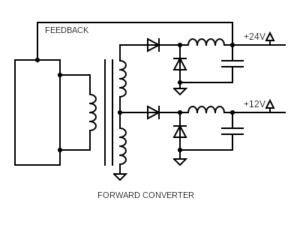 Center tapped transformer – I have designed a 2-switch forward converter (48VDC => 12/24VDC, 100W). As I need two outputs (12V/24V), I have decided to build a center-tapped transformer (for a better cross-regulation) like in the diagram below. Everything works fine, except I’ve got around 21V(??) on the tapped output. The secondary winding it’s made up of two identical layers (the second one (24V) being on top of the first one). So why do I get almost the same output voltage on the center-tapped output? The 24V output goes to the feedback input of the forward controller (UC3845), and it’s very stable. Read more