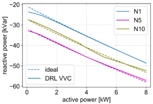 The test simulation included a variable PV energy source. The control algorithm continually adapts to short-term fluctuations in power flow and to changing grid connections over the long term without needing any network connection. The system required real-time independent control of reactive power from -20 to -60 kvar at several power nodes to maintain a level grid voltage (Figure 2). For purposes of the study, a tight voltage tolerance was imposed. In a real-world grid, a wider voltage tolerance can be used meaning less reactive power would be needed and making it easier to implement DRL VVC.