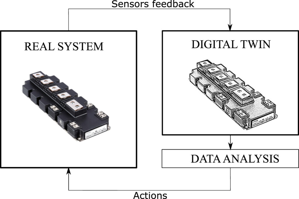 - Sensors on the real IGBT module provide the voltages and currents to be measured and serve as inputs to the digital model.