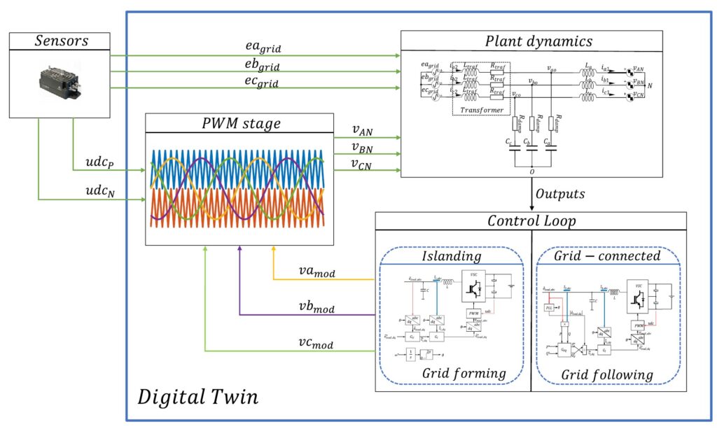 The DT control loop emulates both island and grid following modes (Figure 2). In islanding mode, a grid-forming control scheme is used to maintain the frequency and output voltages (eaload, ebload and ecload) at their nominal values. When the grid is available, a grid following the control scheme has the primary function of charging the battery as needed to maintain an adequate state of charge to ensure energy availability should the power grid fail.