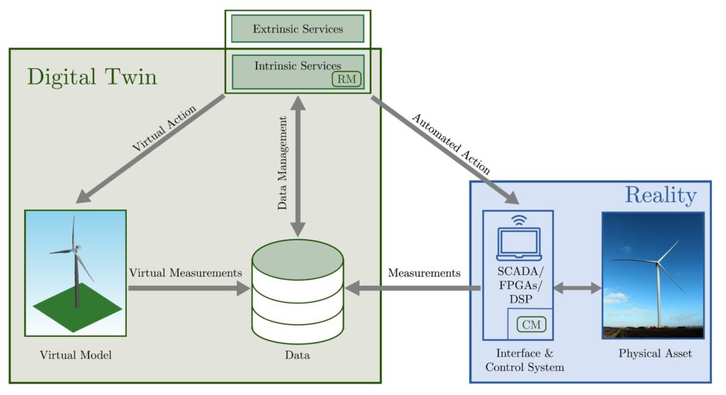 - The physical asset or physical counterpart to the DTS. The physical asset also includes the interface and control system connecting to the DTS. The physical asset and DT comprise numerous sub-elements, including IGBT modules, the drive train, the generator, interconnects to the local power grid, etc.