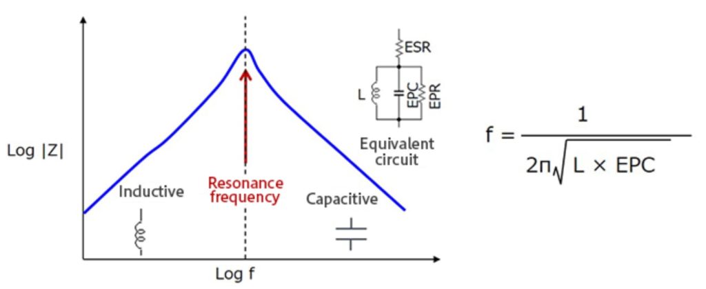 Up to the resonant frequency, the inductive characteristics dominate. Above the resonant frequency, the parasitic capacitance becomes dominant, and the device no longer functions as an inductor. As is evident in the equation above, as the inductance (L) decreases, the resonant frequency rises.