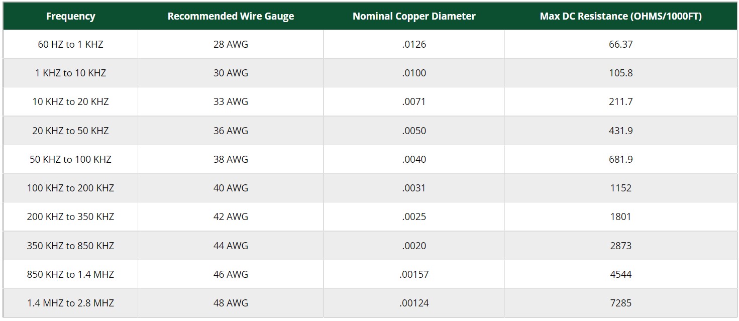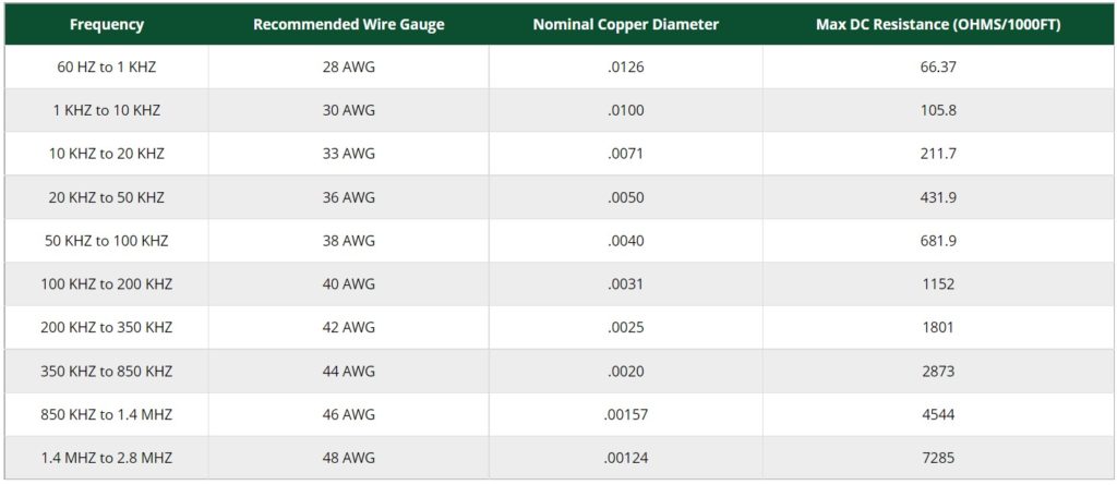The operating frequency is the most important factor when specifying Litz wire. Litz wire braiding often involving several levels. Each level consists of a Litz wire branded with other similar Litz wires. The result of these winding patterns is to equalize the proportion of the overall length of each strand at the outside of the conductor. The following table shows the recommended strand gauge versus frequency for common Litz constructions.