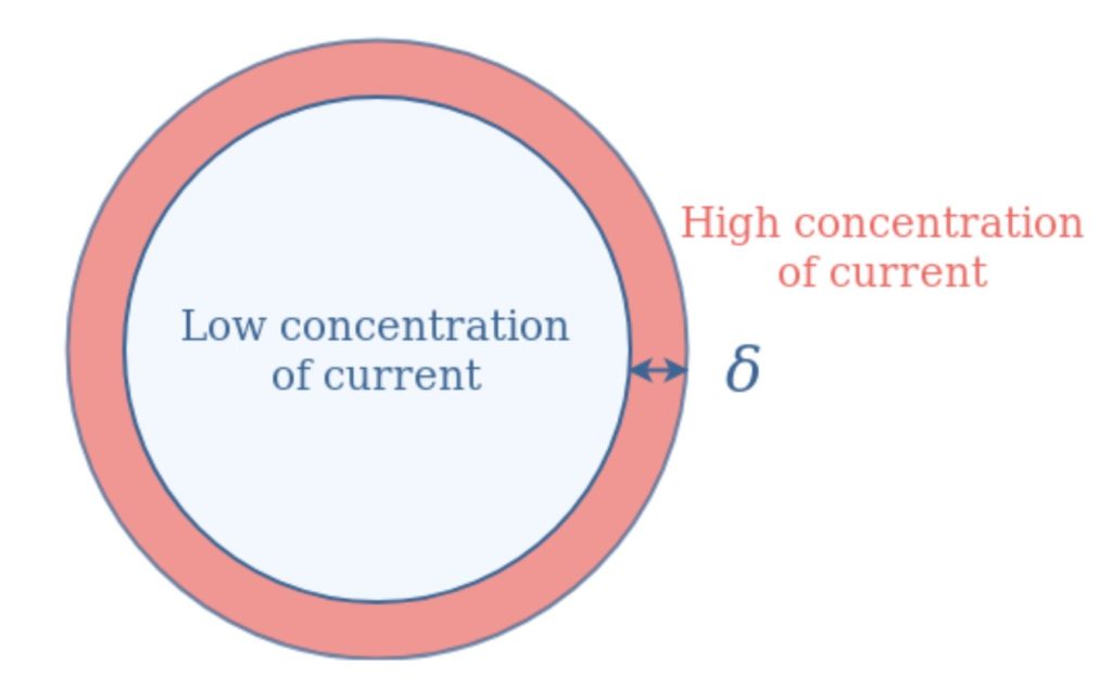 Eddy currents cause the skin effect, and the skin effect grows in importance at higher frequencies. The skin depth, δ, is the most important parameter describing the skin effect. It is a measurement of the thickness of the area where most of the eddy currents are concentrated and is proportional to 1/√f, where f is the frequency. Increasing the frequency decreases the skin depth. At high frequencies, the current is concentrated in a relatively small region, reducing the effective current carrying capacity of the wire and increasing losses. Over 98% of the current will flow within a layer 4 times the skin depth from the surface in a high-frequency design.