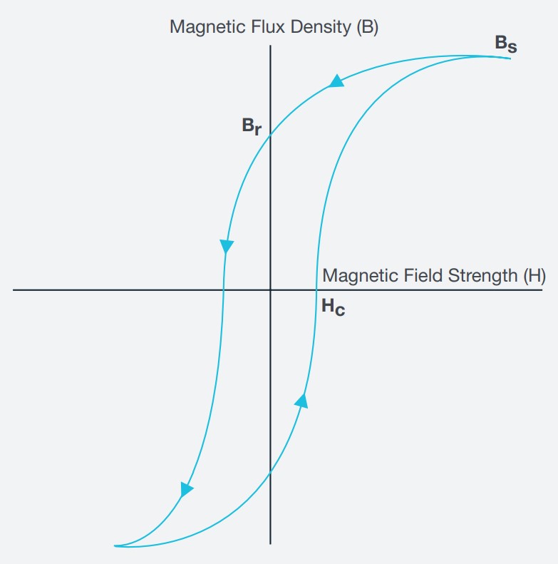 The relationship between the magnetizing force, H, and the flux density, B, is shown on a hysteresis curve or loop. The hysteresis loop area shows the energy required to complete a full cycle of magnetizing and demagnetizing, and the area of the loop represents the energy lost during this process.