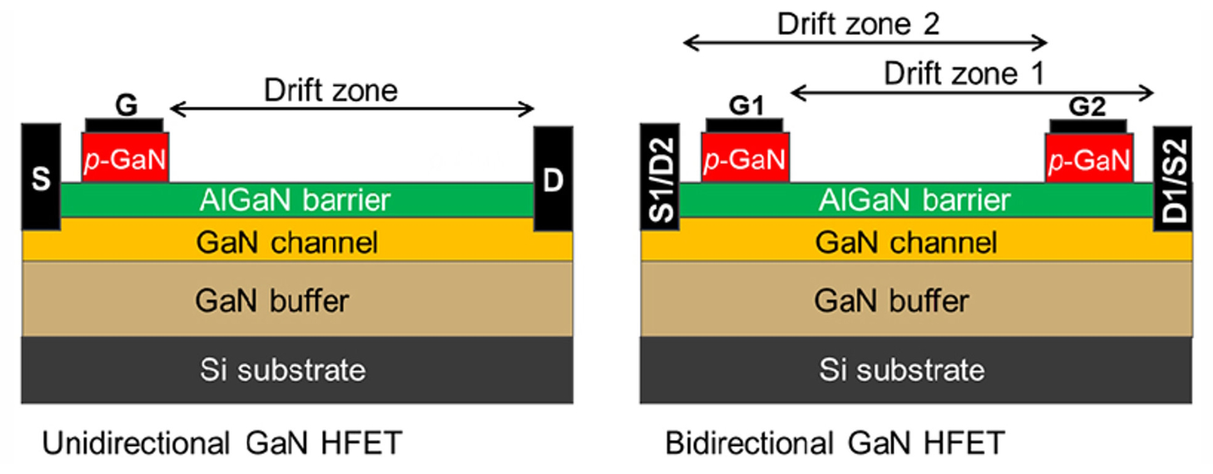 To produce the bidirectional HFET, a second gate (G2) is added to the drift zone close to drain D1 and is used as the controlling gate for one direction of operation (Figure 1). The bidirectional GaN HFET is symmetrical and can carry the same current in both directions.