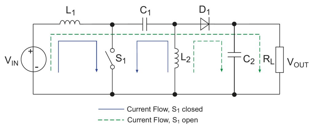 A Zeta converter is another variation on the SEPIC (Figure 6). Sometimes called an inverse SEPIC, the Zeta converter uses a buck converter followed by a boost stage, while the SEPIC has a boost stage followed by a buck. Like the SEPIC, the Zeta topology has a positive output voltage.