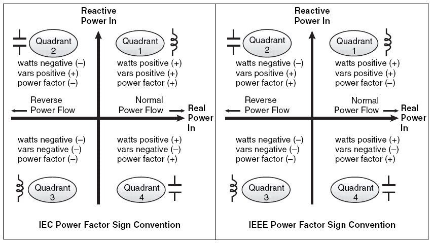 The sign (positive or negative) of the PF depends on the standard being used and is different for the IEC and the IEEE. Using the IEC standard, the direction of real power flow determines the sign of the PF. the PF is positive for “normal” (positive) real power flow when the load is consuming energy. The PF is negative for “reverse” (negative) real power flow when the load generates energy.
