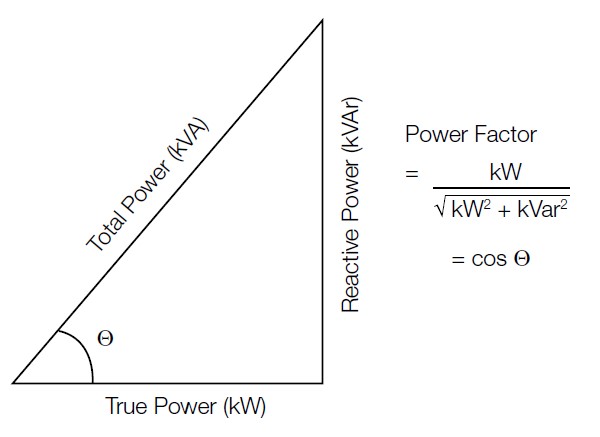 Real, or “true,” power is measured in Watts. Apparent, or “total,” power is measured in volt-amps (VA) and is the product of the RMS voltage and RMS current. Finally, reactive power is expressed in VAr, which stands for volt-amp-reactive. Reactive power is also referred to as “wattless power” since it transfers no net energy to the load. As illustrated below, the power factor measures the ratio between total power and true power (or the ratio between apparent and real power). A load with a low power factor draws more current than a load with a high power factor for the same amount of useful power transferred. As the reactive power decreases (the load becomes more purely resistive), the total power and true power become equalized, and the power factor approaches unity.