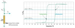 TTape is a strip of ten temperature sensors that you attach to battery packs in EVs, commercial vehicles, and energy-storage systems. The sensors are essentially a series of ten temperature-sensitive switches. When any of the sensors detect an over-temperature condition of 61°C, that sensor will enter a high-impedance state. An external pull-up resistor raises the logic-level voltage that you can use to trigger an action. Hysteresis keeps the switch open until the temperature drops to 55°C. The schematic and voltage plot show how the sensors work. According to Littelfuse, the fixed temperature supports most cell systems for use in degradation management and thermal-runaway protection. The company says that other temperature threshholds will be available later in 2024.