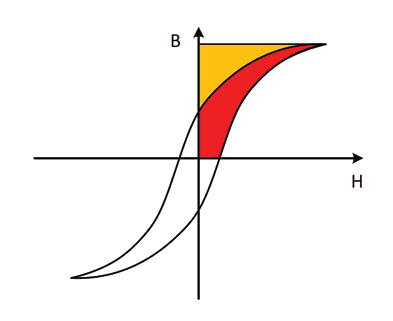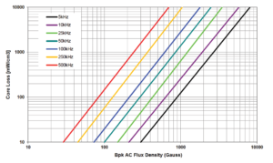 Energy lost in the core is the area traced out by the B-H loop multiplied by the core’s volume. The power loss is this energy (E) multiplied by the switching frequency.