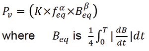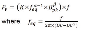 where Pv is the core loss (hysteresis and eddy current loss) for unit volume, f is the frequency, Bpk is peak flux density of a sinusoidal excitation, and K, α and β are the constants derived from core loss graph. The data given for core losses usually includes the effects of both hysteresis and core eddy currents.