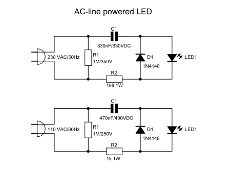 - ElecCircuit, “Many Simple LED AC mains voltage & current indicator circuits”