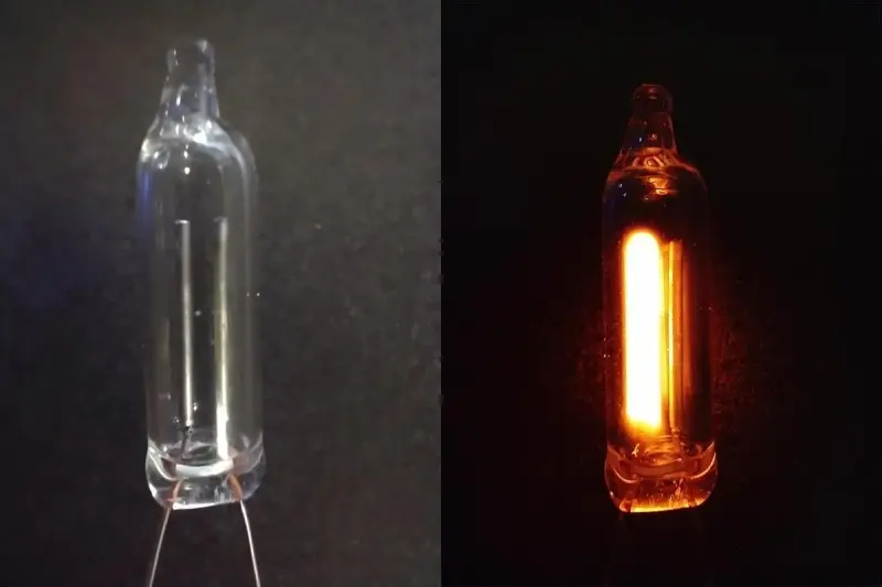 A: A neon lamp is a gas-discharge light source with a reddish-orange glow (Figure 1). The specific color is determined by the presence of the low-pressure neon gas along with some minute additive gases (in some cases enclosed in the lamp). The lamp has two identical electrodes, usually made of nickel or molybdenum, where one functions as the anode and the other as the cathode.
