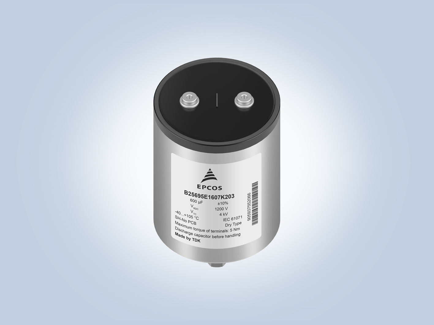 TDK Corporation presents a new series of EPCOS power capacitors for DC link applications designed for an operating temperature of up to +105 °C. The components with the ordering code B25695E can operate at rated DC voltages from 700 V to 1300 V (voltage derating necessary from +85 °C). The ESR ranges from 1.0 mΩ to 2.7 mΩ, resulting in a current capability of up to 110 A at +70 °C, depending on the model (current derating necessary at higher temperatures). However, the film capacitors can repetitively withstand current peaks of up to 15.8 kA. At the rated voltage and +75 °C, their service life is 120,000 h – up to 35% more than the standard version.