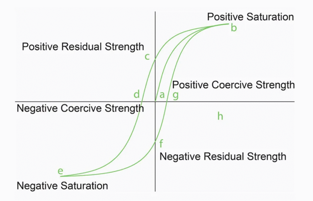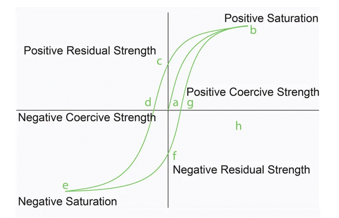 The measurement convention is to increase H and track the increase in B, traveling along the hysteresis curve in a counterclockwise direction. Once the material has become magnetically saturated at point “b,” the magnetizing force begins decreasing, reversing its polarity at point “c” and continuing to grow stronger in the opposite direction until reverse saturation is reached at “e.” Hysteresis curves are useful in determining several properties of magnetic materials, including: