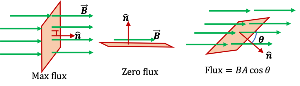 Magnetic flux (Φ or ΦB) and magnetic field are related concepts. Magnetic flux quantifies how much magnetic field passes through an area. ΦB is the surface integral of the normal component of the field vector B over that surface. The angle at which the field vectors (field lines) intersect the measured area is important. If a field is parallel to a surface, there will be no flux. Maximum flux is generated when the field is perpendicular to the surface. If the surface is at an angle, θ, to the field vectors, the flux can be stated as ΦB = BAcosθ, where A = the area (Figure 2). Magnetic flux density, also called magnetic induction, is often denoted by “B” and is quantified in teslas (T).