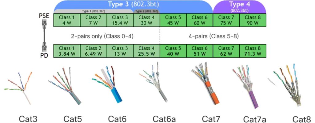 - IEEE 802.3bt–2018 up to 71 W (also called 4PPoE)