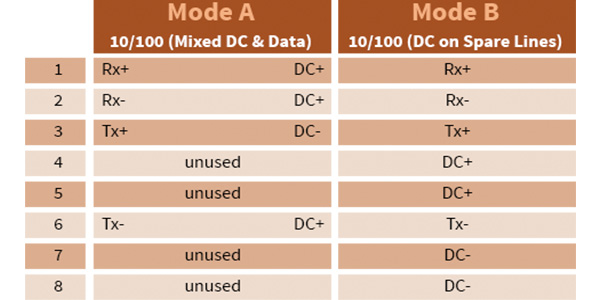 Mode A, sometimes referred to as Alternative A, uses two pairs of data pinouts 1-2 and 3-6 to transmit or receive power and data, and the other two pairs 4-5 and 7-8 pinouts are unused.