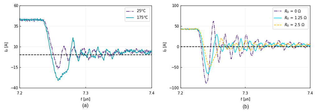 Figure 4a shows the temperature dependence of the reverse recovery current. The test parameters include an RG(ext) = 5 Ω, VDS = 800 V, and ID = 40 A. Increasing external gate resistance is recommended to achieve softer recovery characteristics such as reduced Qrr, Irrm, and dampened ringing. Improvements in reverse recovery obtained from increasing RG(ext) are shown in Figure 4b). Higher gate resistance reduces the risk of snappy reverse recovery and can increase switching losses due to increased trr if overly dampened. Figure 4b) shows the reverse recovery current plotted versus time for various external RG values. The reduced ringing effect in the current waveform will reduce unwanted EMI.