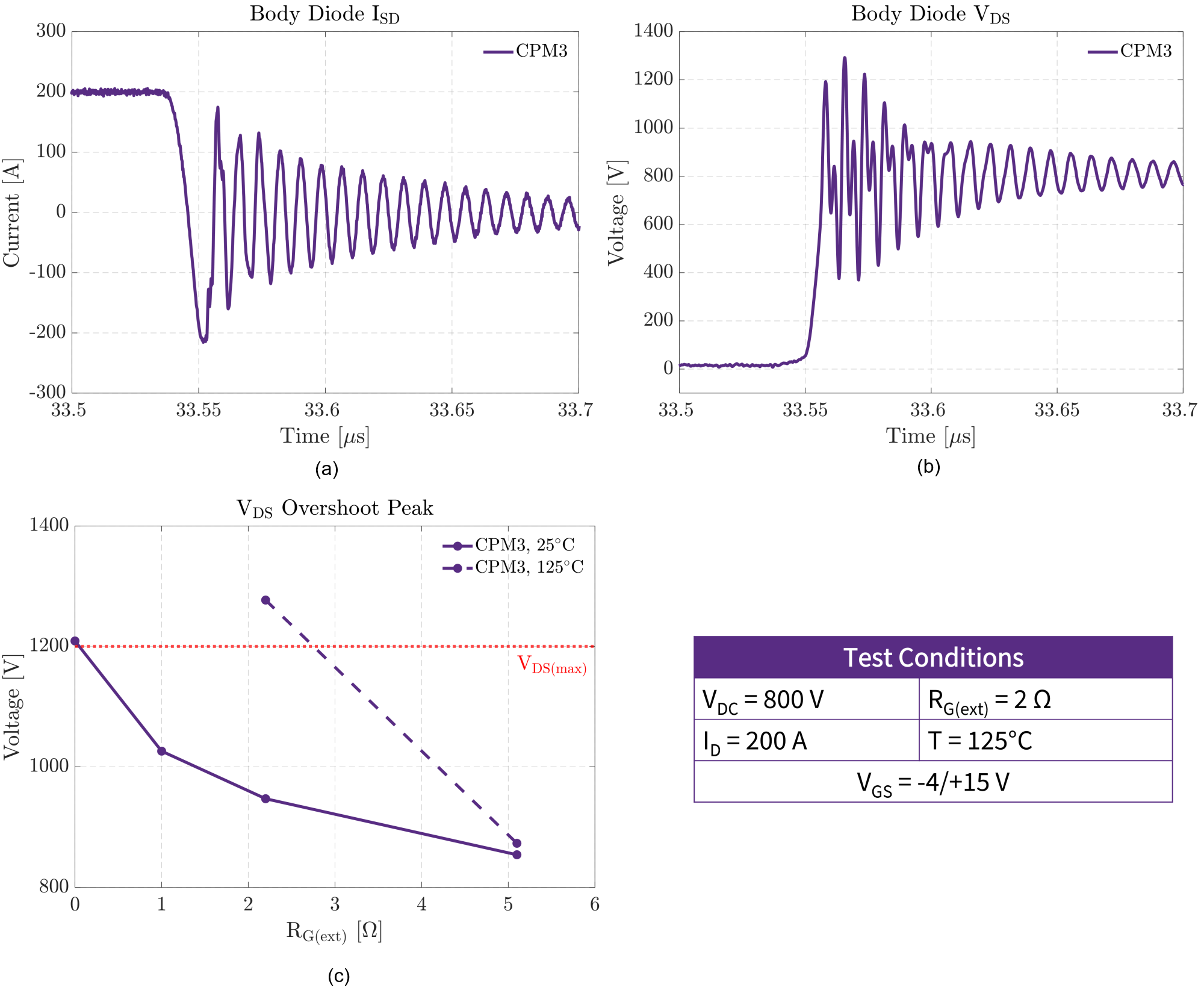 Figure 5a shows the ISD recovery waveform of the low-side device as a function of time at T = 125°C and VDS = 800 V. Figure 5b shows the VDS recovery waveform as a function of time and Figure 5c shows the peak VDS value as a function of external gate resistance. The devices tested are in a half-bridge configuration with 4 dies in parallel per switch position. As expected, the VDS peak decreases as RG(ext) increases. An RG(ext) >3 Ω is required to remain within the device’s SOA.