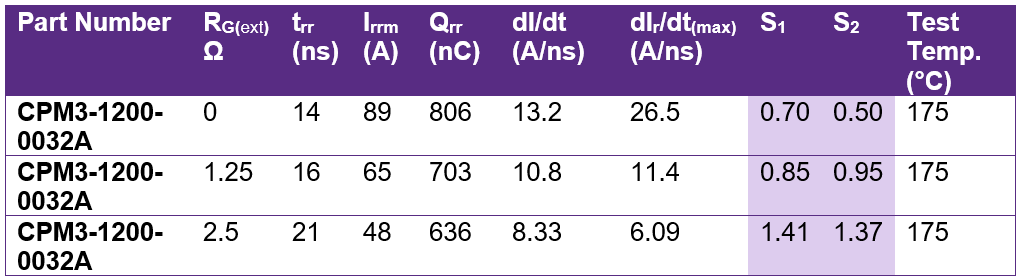 Table 1 demonstrates that increasing RG will decrease dI/dt and Qrr and dampen the initial oscillatory peak current level. In contrast, increasing RG also increases trr, creating a tradeoff between overshoot and switching times. Always visually inspect the waveform after measuring it.