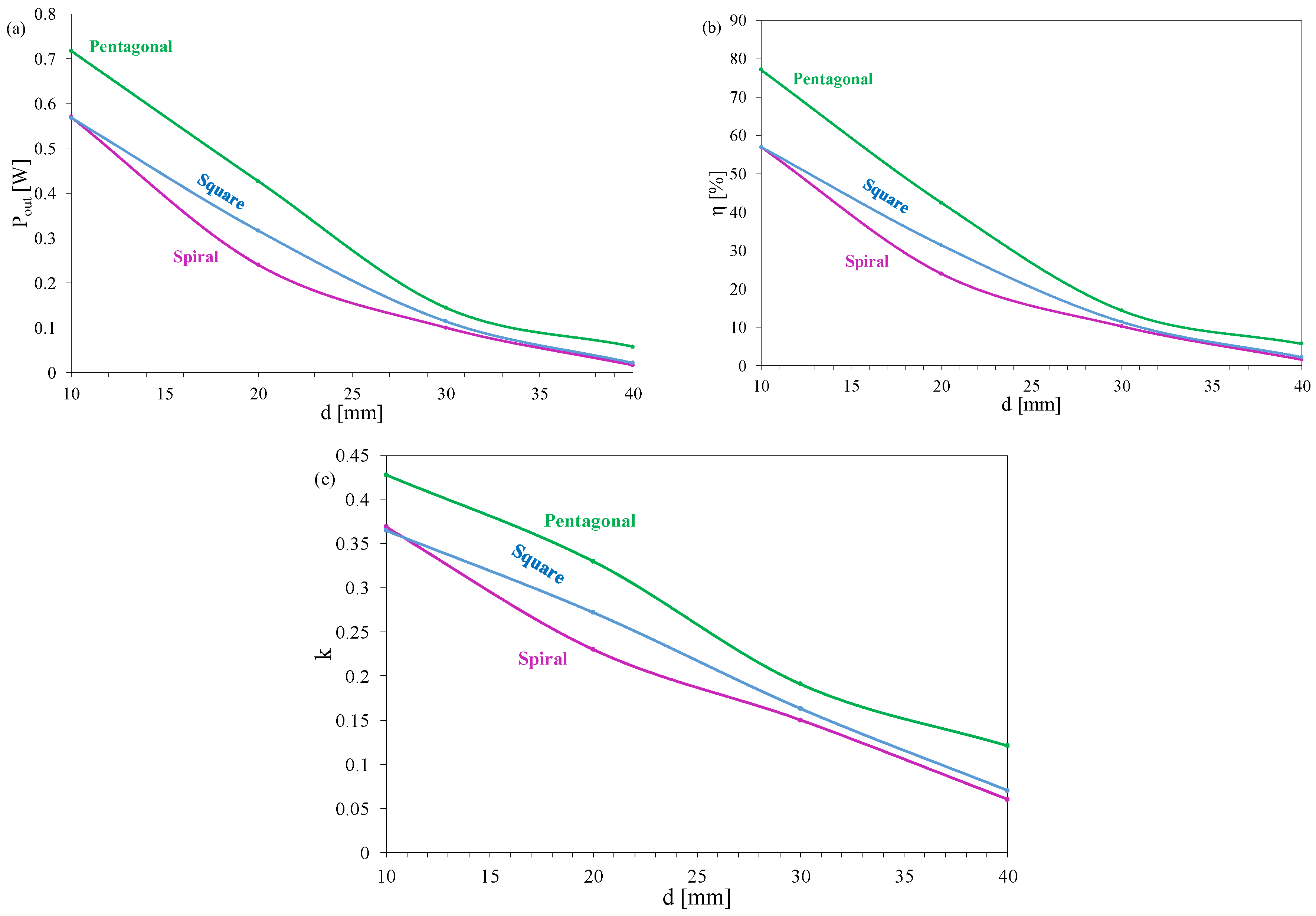 However, the three graphs clearly show that the pentagonal coil outperforms its counterparts by a large margin, at least during the first half. When the distance reaches the 30 to 40 mm range, the performance differences shrink, especially for output power and energy transmission efficiency.