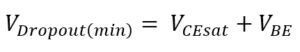 The minimum voltage drop across the BJT output stage is the sum of the emitter-collector saturation voltage of the PNP transistor and the voltage drop of the base-emitter junction of the NPN: