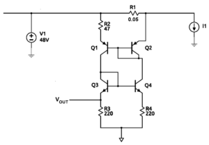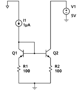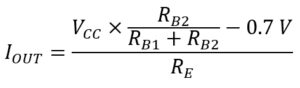 Like that shown in Figure 3, the current mirror circuit is commonly used as a current source to ‘bias’ (set the operating point) other application circuits like amplifiers or comparators. Assuming that both transistors are identical and R1 = R2, IOUT will exactly replicate IIN. This is expressed mathematically as: