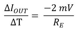 Unfortunately, the stability of the output current is impacted by the negative temperature coefficient of VBE, which is approximately −2 mV/K, meaning the change in output current over temperature is: