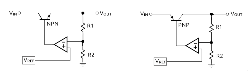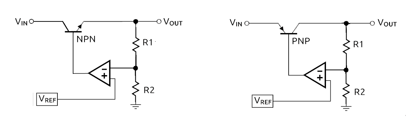 Within the family of linear regulators exists a subgroup called low-voltage dropout regulators (LDOs). While standard linear regulators based on an NPN BJT require headroom between their input and output voltage of at least VCEsat + VBE, the only headroom required by an LDO realized with a PNP BJT is VCEsat. Using a low VCEsat BJT helps to keep this headroom very small. Figure 2 (a) shows an LDO using an NPN BJT in the load path, while Figure 2 (b) uses a PNP BJT. These linear regulators are optimal for battery-powered applications because of their high efficiency. The high forward gain of low VCEsat BJTs increases efficiency because they need low driving currents.