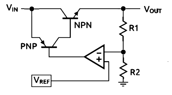 An error amplifier tracks output voltage using a resistor divider to regulate it. The error amplifier compares this feedback voltage to a reference voltage (VREF) and adjusts the PNP-BJT base drive accordingly, which in turn adjusts the drive of the pass transistor. In this way, if the feedback voltage exceeds the reference voltage, the error amplifier lowers the base current and vice versa.