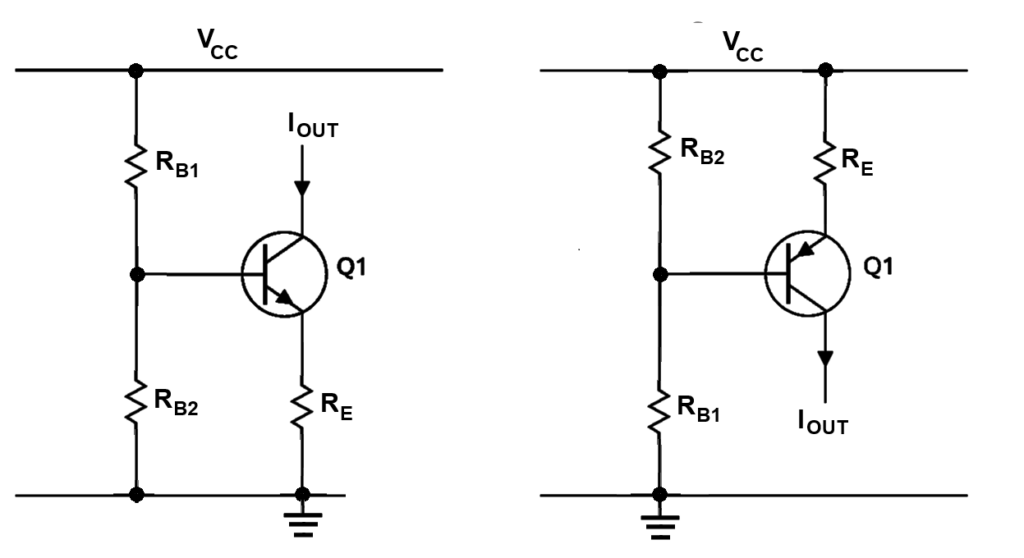 You can partially compensate for this by using a PN or Zener diode to replace the ground-connected resistor in the base bias circuit. The benefit of using a Zener diode is that IOUT is independent of VCC, increasing its immunity to supply voltage ripple. Very precise current stabilization can be achieved by combining a BJT with a base drive controller (shunt regulator) to provide an accurate and thermally compensated control loop.