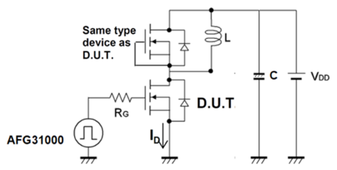The inductor (L) simulates circuit conditions expected in the converter design. A power supply is needed as a voltage source for the test. An arbitrary function generator (AFG) produces the triggering pulses for the device gates, and an oscilloscope captures and measures the results (Figure 1).