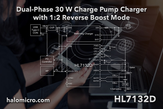 Halo Microelectronics announces the launch of its HL7132D, a dual-phase 30 W charge pump with 1:2 reverse boost mode.