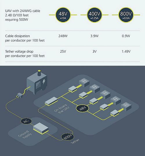 It should be apparent moving to an 800-V source for the ground supply is the way to optimize power transmission up the tether. But the UAV must convert that 800 V down to low voltages to power its motors and electronics. For this part of the PDN, 48 V for the onboard electronics makes the most sense for reasons described earlier.