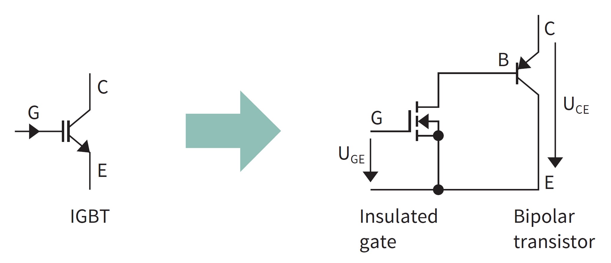 - A positive voltage (UGE) from gate to emitter turns on the MOSFET gate.
