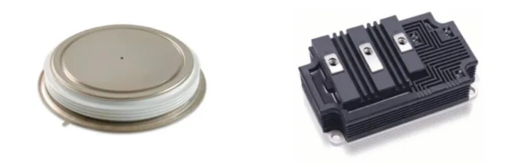 An IGCT is the thyristor equivalent of an IGBT. Since they are a type of thyristor, IGCTs are delivered in press pack packages. That contrasts with IGBTs which are available for a wider range of applications and are offered in a wider range of package styles (Figure 3). An IGCT is a combination of a GTO with an integrated gate structure. It delivers the high power density and low conduction losses of a GTO with a simplified gate drive.